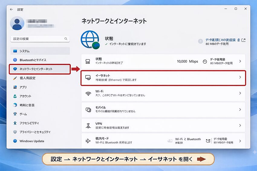- 1.設定 → ネットワークとインターネット → イーサネット