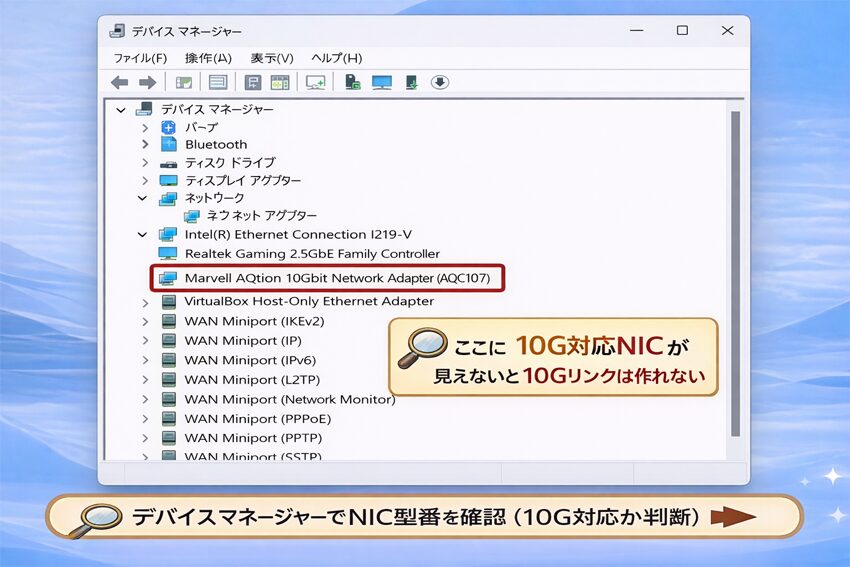 | OS/設定 | 既定のまま | ドライバ更新+基本設定見直し | 最低限:リンク10G確認 | デバイスマネージャ/詳細設定 | 省電力で落ちる/VPN・監視系がボトルネック |