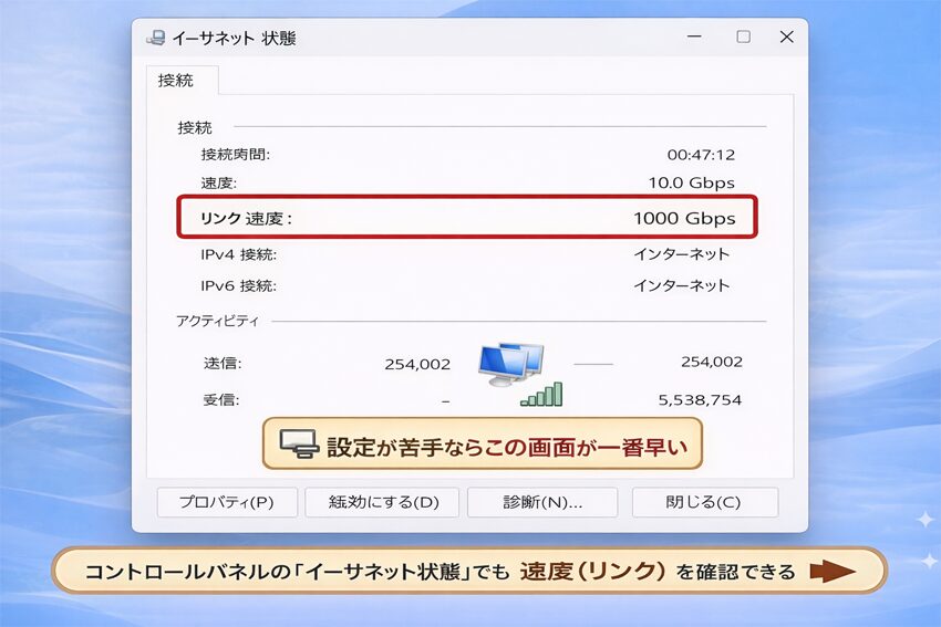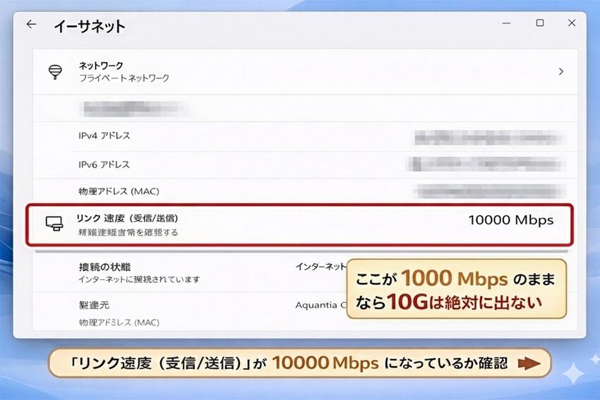- A. まず「リンク速度」が10000Mbpsになっているか確認してください。1000Mbpsのままなら、(1)スロット帯域(x1など)(2)ケーブル(CAT5e/劣化)(3)ルーター/ポートが1G (4)ドライバ未更新、の順で疑うのが最短です。