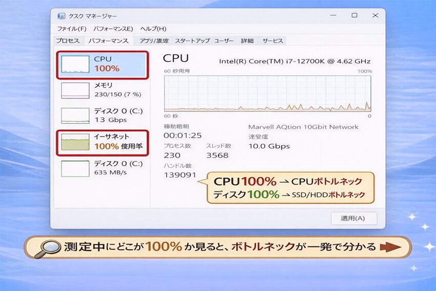 | CPU | 古い4コア | Core i7 / Ryzen 7級(直近3世代目安) | i5/Ryzen5でも新しければ可 | 速度測定中のCPU使用率 | CPU100%で頭打ち/セキュリティ干渉 |