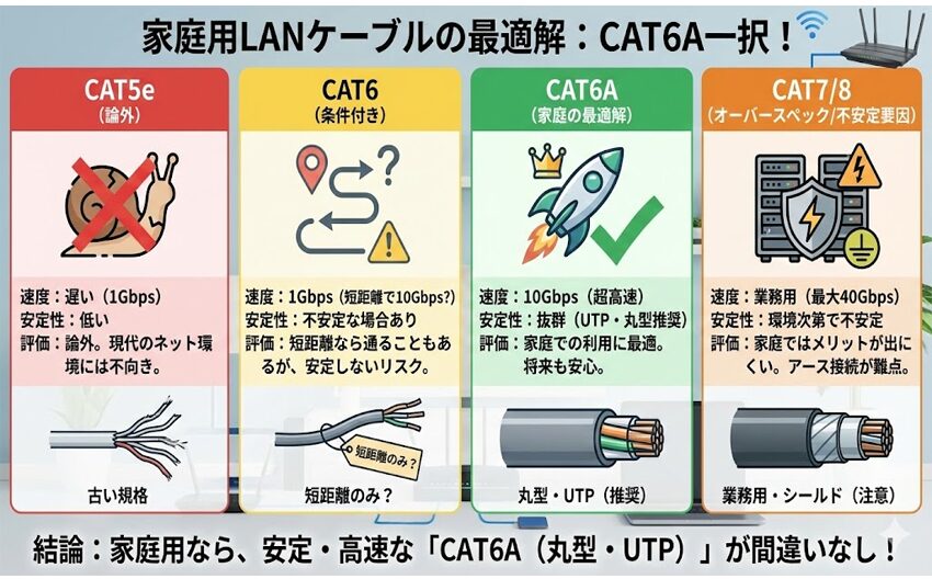 - A. 家庭用なら基本はCAT6A(丸型・UTP)が最適解です。CAT7/8は環境次第でメリットが出にくく、まずは「リンク速度10000Mbps」になっているかが重要です。