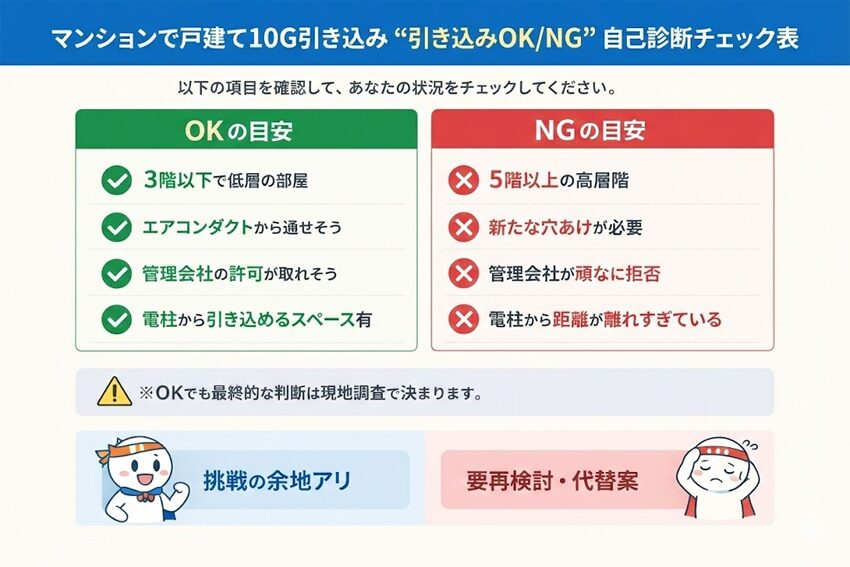 検索で出てくる“マンション10G”は、建物がそもそも光配線に対応してないと「提供不可」になったり、契約できても結局VDSLのまま…という罠があります。