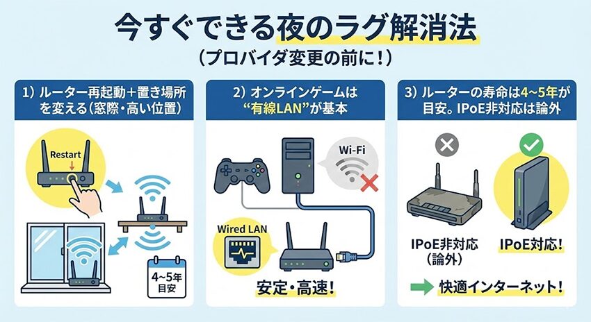 夜ラグの原因は回線だけでなく、Wi-Fi干渉・ルーター性能・配線方式も絡むので、ゲーム機/PCは有線、ルーターはWi-Fi 6以上、LANケーブルはCAT6A以上が鉄板。
