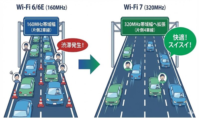 Wi-Fi 7では、最大帯域幅が160MHz→320MHzへ拡張。たとえるなら、片側2車線が4車線になって渋滞しにくくなるイメージです。