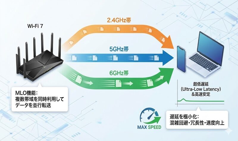 MLOはWi-Fi 7の目玉。複数の周波数帯(例:2.4GHz+5GHz、または5GHz+6GHz)を同時に使うことで、混雑や干渉に強くなります。Wi-Fi 7認証においてMLOは重要機能として扱われています。
