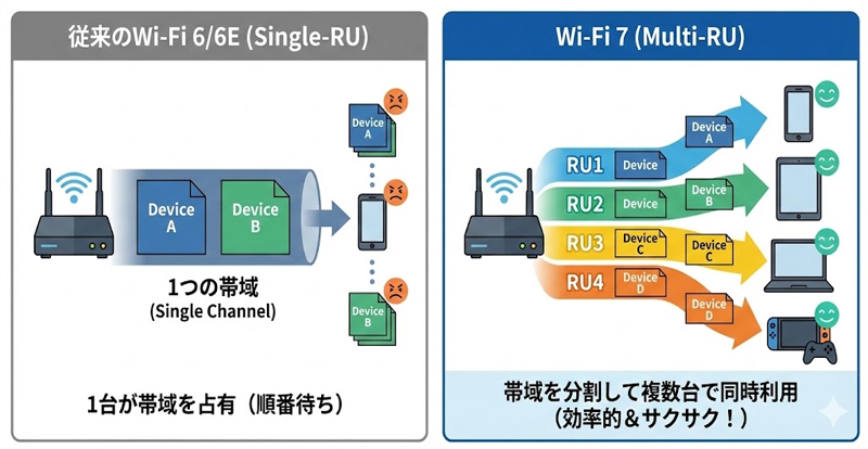 Wi-Fi 7はMulti-RUやMLOで“同時接続に強い設計”なので、ファミリー用途と相性が良いです。