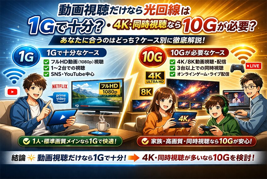 動画視聴メインの人は、使わない10Gに課金するより、夜でも混雑しにくい1G回線へ乗り換えるほうが満足度が高くなりやすいです。