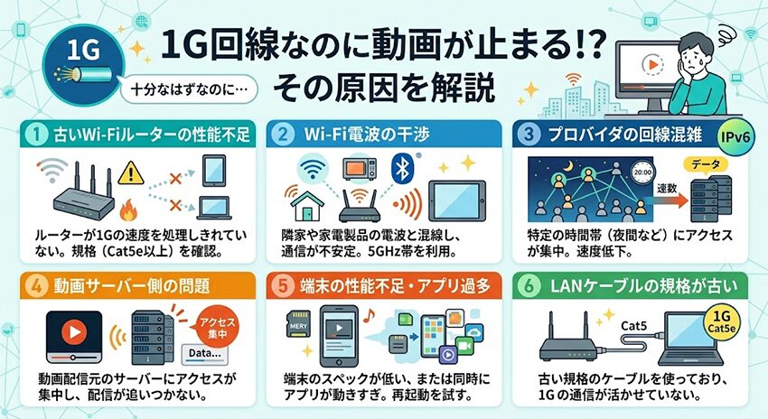 動画視聴メインなら1Gで十分なはずなのに止まる。これは1Gという数字が足りないからではなく、別の場所で詰まっていることが多いです。