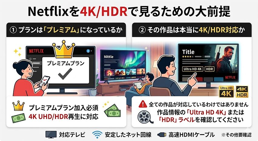 Netflix特有の4K/HDR条件とPCブラウザの罠に主役を絞って解説します。