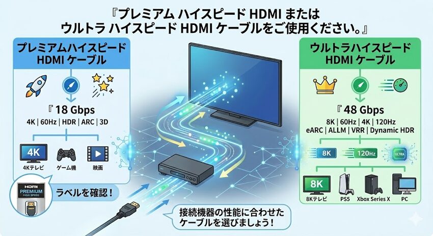 Netflixはプレミアムプランの画質を出すには、Premium High Speed HDMIまたはUltra High Speed HDMIケーブルを使うよう案内しています。