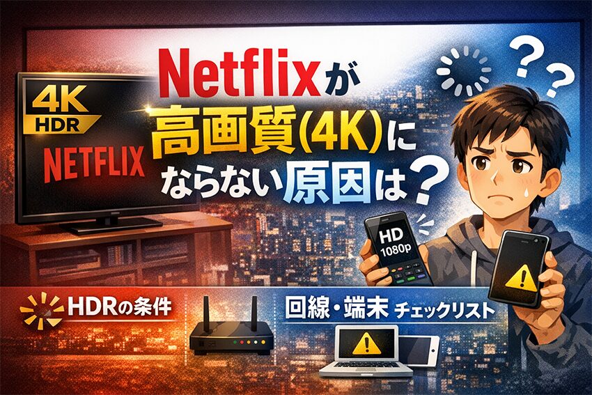 この記事では、プラン→作品→端末→設定→回線の順番で、Netflixが4Kで見れない原因を切り分けます。