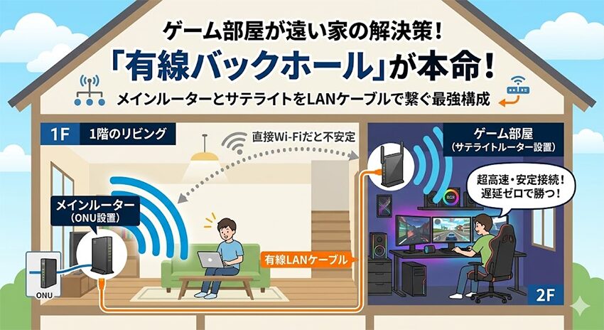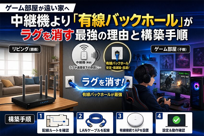 ゲーム部屋が遠い家へ|中継機より「有線バックホール」がラグを消す最強の理由と構築手順