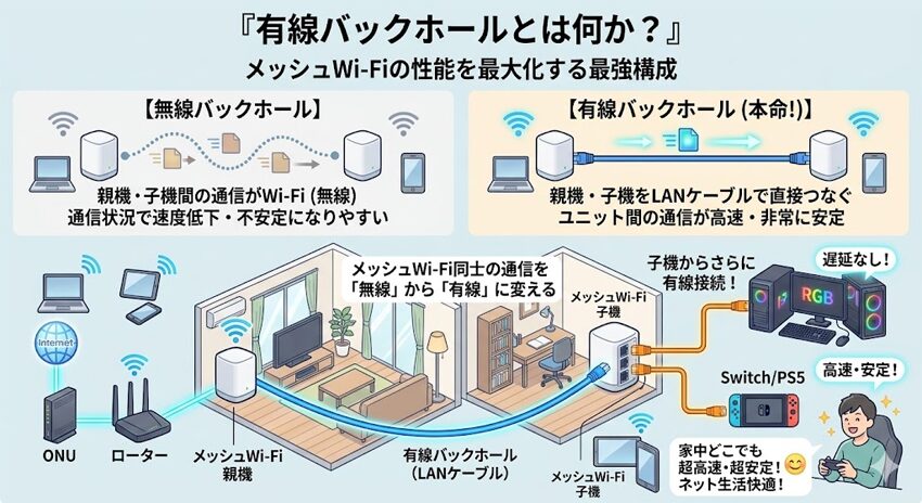 一方で、有線バックホールは、親機と子機の間をLANで結び、ノード間通信をWi-Fi帯域から外せます。