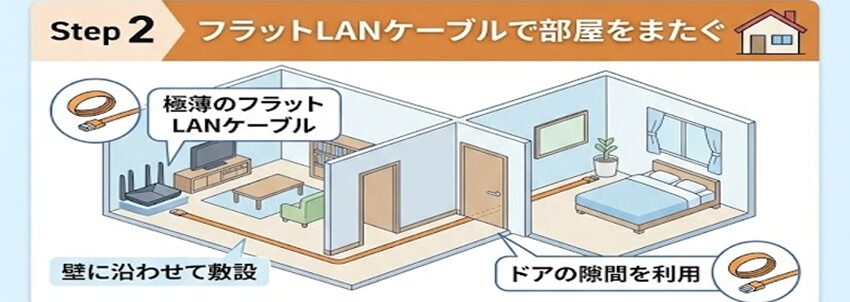 むしろ大事なのは、ドアのヒンジで強く潰さない、巾木沿い・カーペット下・壁際をきれいに通すことです。