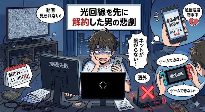 この順番を崩して先に解約すると、回線種別や時期によっては2週間〜1か月以上、自宅のWi-Fiが消える可能性があります。