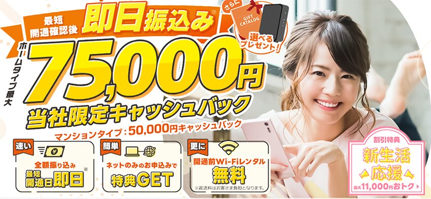 主な特典31日間体験・ルーターパック最大75,000円キャッシュバック窓口あり最大45,000円キャッシュバック窓口あり・違約金還元1ギガ新規/事業者変更39,000円・10ギガ新規57,000円