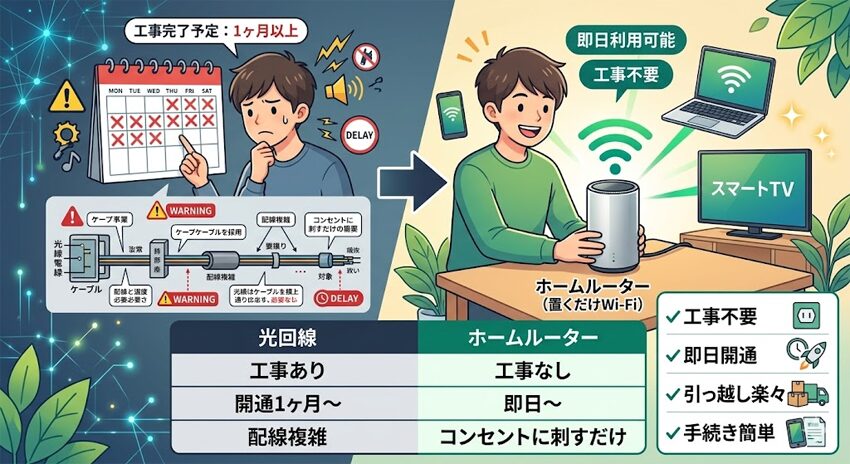 つまり、今日明日からネットが必要なら、光回線の工事を待つよりホームルーターのほうが現実的な場面は多いです。