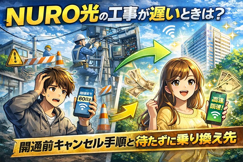 この記事では、NURO光の工事が長引きやすい理由、最新のキャンセル手順、そして待たずにネットを復旧しやすい乗り換え先まで、開通前ユーザー向けにまとめて解説します。