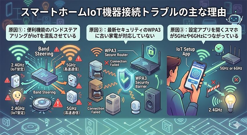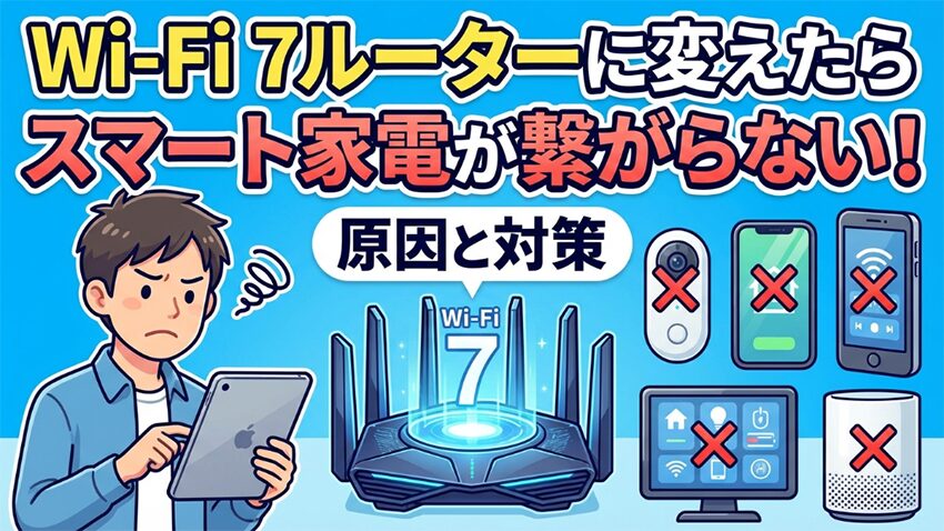 Wi-Fi 7ルーター側の便利機能や強いセキュリティ設定と、2.4GHz中心で動く古いIoT機器側の相性でつまずいているケースが多いからです。