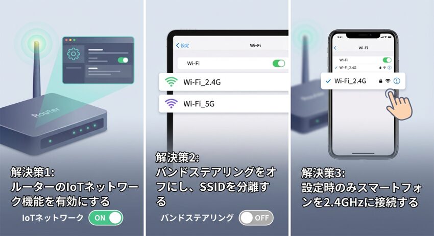 つまり、IoT機器の初期登録だけ2.4GHzで行い、その後スマホを5GHzや6GHzへ戻しても、同じ家庭内LANとして見える構成なら操作は続けやすいです。