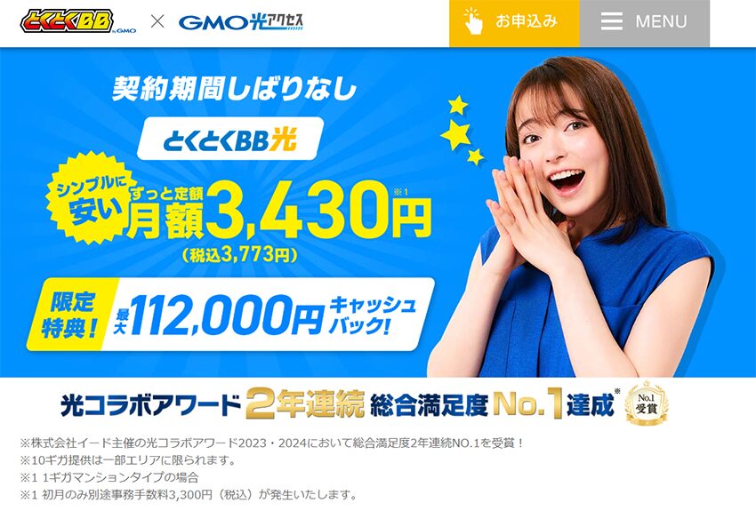 一方、GMOとくとくBB光1ギガマンション4,290円、1ギガファミリー5,390円、しかも契約期間の縛りなし・解約違約金0円を打ち出しています。