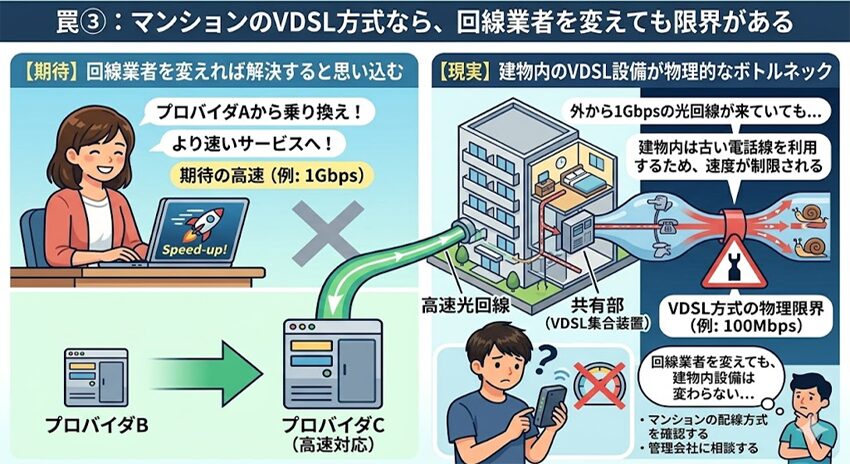 罠③:マンションのVDSL方式なら、回線業者を変えても限界がある