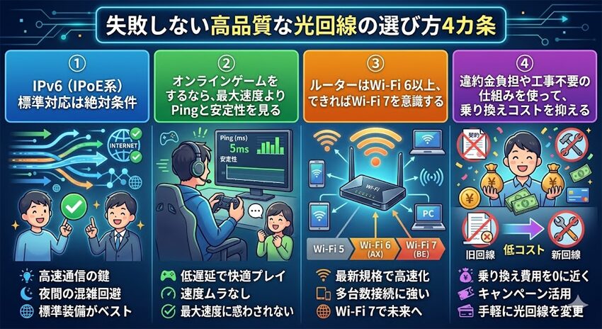 つまり、夜間混雑を避けたいなら、IPv6(IPoE系)対応は最低条件です。