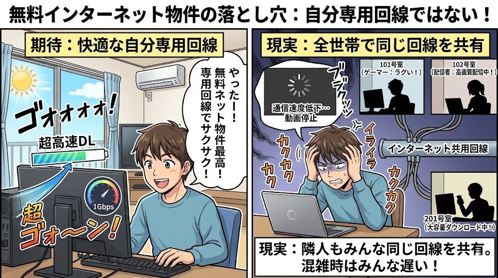 無料インターネット物件の弱点は、自分専用回線ではないことです。