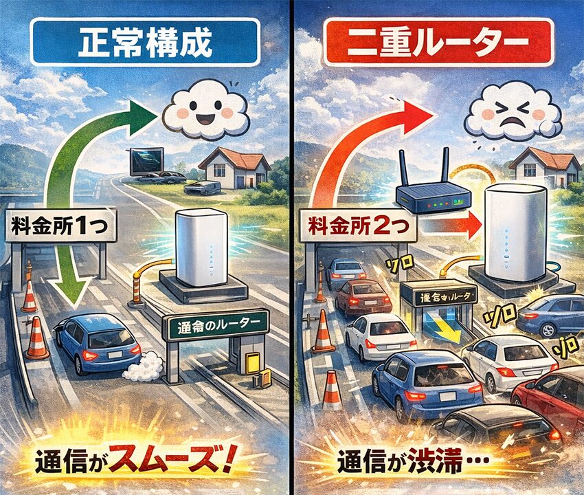 そんなときは、回線速度そのものより先に二重ルーター(二重NAT)を疑ってください。