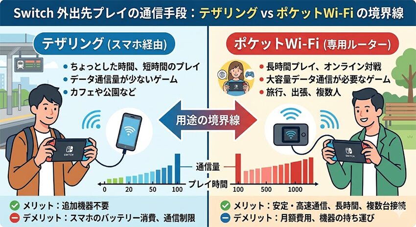 外出先でSwitchをオンラインにつなぎたいとき、最初に迷うのがスマホのテザリングで済ませるか、ポケットWi-Fiを用意するかです。