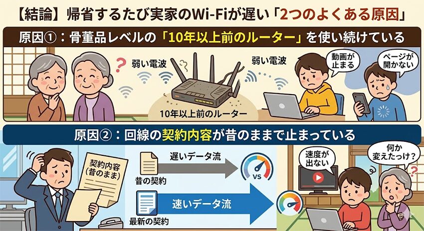 帰省中の実家Wi-Fiが遅いとき、まず疑うべきは2つだけです。
