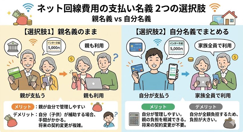 大きく分けて、親名義のまま動かすか、自分名義でまとめて払うかの2択です。