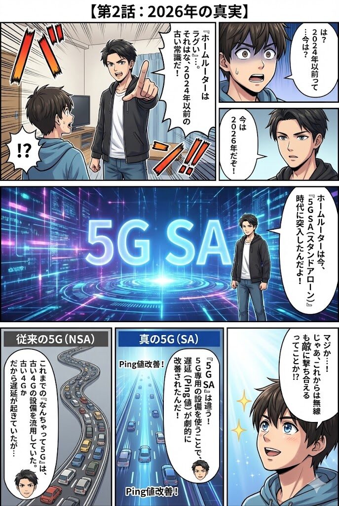 2026年現在、ホームルーターは「5G SA(スタンドアローン)」時代に突入しました。 従来の4G設備を流用していた「なんちゃって5G」とは異なり、5G専用設備を使うことで、遅延(Ping値)が劇的に改善されています。