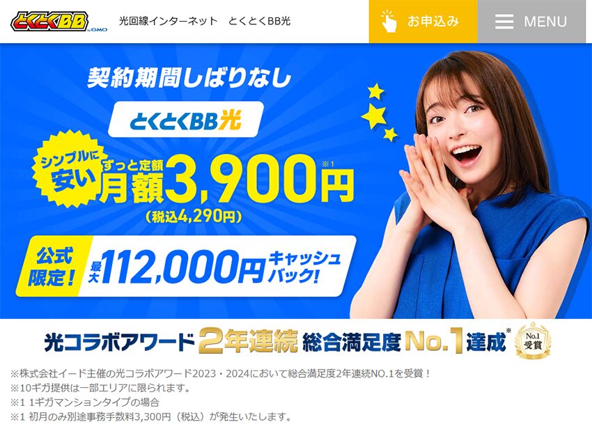 • 現金キャッシュバック!最大25,000円!違約金負担額!最大6万円              👉 GMOとくとくBB光 がおすすめ(いつ解約しても違約金0円!)