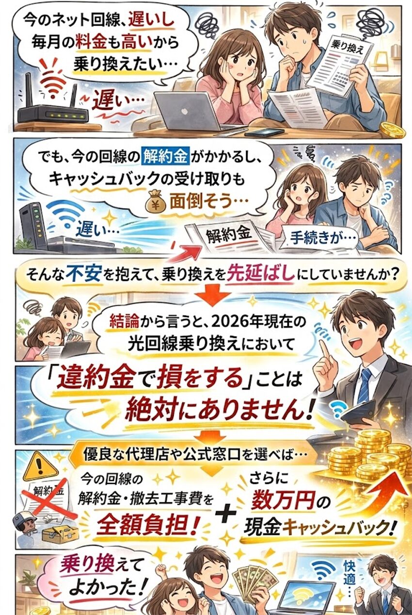 「解約金がかかるから…」と我慢して毎月高い料金を払い続けるのは、非常にもったいないです。 2026年現在、各社の「違約金全額負担」と「高額キャッシュバック」のダブルキャンペーンはかつてないほど充実しています。