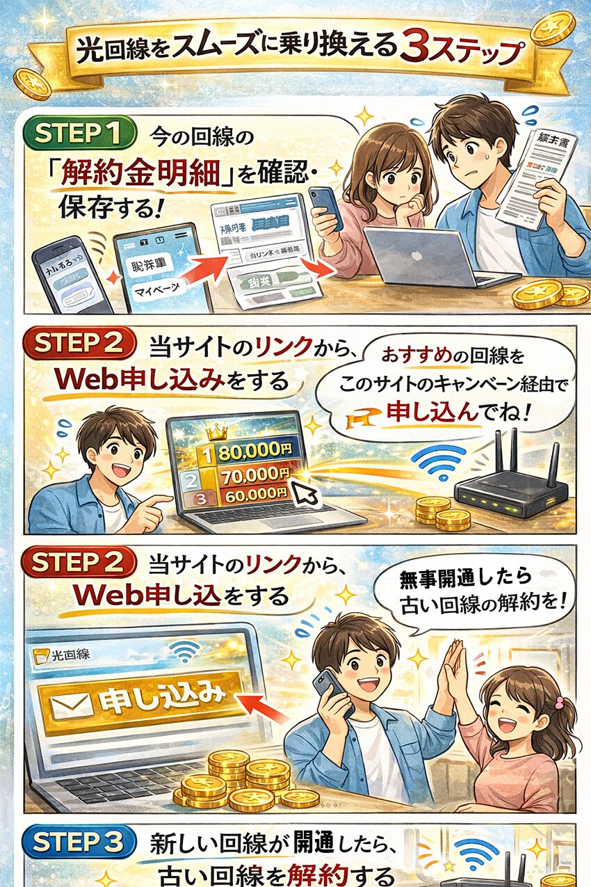 ネットが使えない期間(空白期間)を作らないための鉄則です。必ず「新しい回線を申し込む」→「新しい回線が開通する」→「古い回線を解約する」という順番を守ってください。